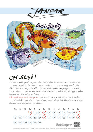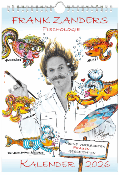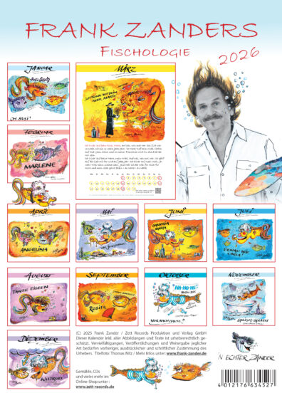 Ab sofort gibt es Frank Zanders Fischologie Wandkalender 2026 mit zwölf Fischen, die sich alle um die musikalischen Frauengeschichten des Berliner Kultkünstlers drehen. Wir treffen z.B. den „Oh Susi“ Fisch, trinken auf das Wohl von Marie, feiern mit Marlene und singen mit der alten Dame Hertha – die Frauenfassung der Fußball-Vereinshymne „Nur Nach Hause…“ von Hertha BSC. Jeder Fisch ist ein echter Hit aus Zanders langjähriger Karriere. Zusammen mit den Originaltextzeilen seiner Hits und einem QR-Code zum Reinhören ist der Fischologie-Kalender 2026 nicht nur ein Hingucker, sondern auch eine musikalische Erinnerung.